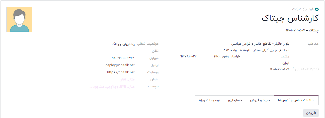 چیتاک به شما اجازه میدهد که مخاطبان را به دو صورت فردی و شرکتی اضافه کنید. بسته به نوع مخاطبی که اضافه میشود، انتخاب کنید که فرد یا شرکت باشد.