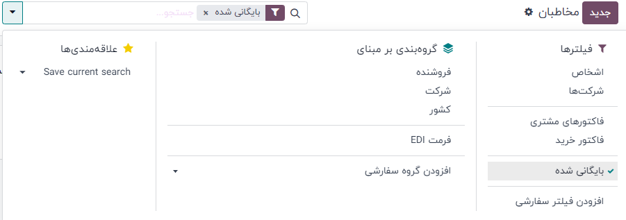 برای جستجو کردن مخاطبان آرشیو شده در برنامه مخاطب ، در نوار جستجو برروی فلش پایین کلیک کرده و برروی گزینه بایگانی شده کلیک می کنیم: