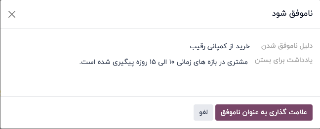 با کلیک بر روی گزینه "ناموفق"، پنجرهای با عنوان "ناموفق شود" باز میشود. از منوی کشویی "دلیل ناموفق شدن"، یک دلیل موجود برای از دست دادن را انتخاب کنید. اگر دلیل مناسبی در دسترس نیست، با وارد کردن دلیلتان و انتخاب گزینه ایجاد یک دلیل ایجاد میکنید.