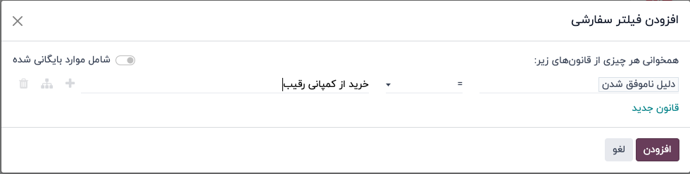 برای فیلتر کردن فرصتها بر اساس دلیل ناموفق خاص، دوباره روی آیکون 🔻 (مثلث رو به پایین) در سمت چپ نوار جستجو کلیک کنید تا منوی کشویی باز شود. علاوه بر فیلتر ناموفق در ستون فیلترها، می توانید از قسمت فیلتر های سفارشی فیلتر های مورد نظر خود را اضافه کنید.