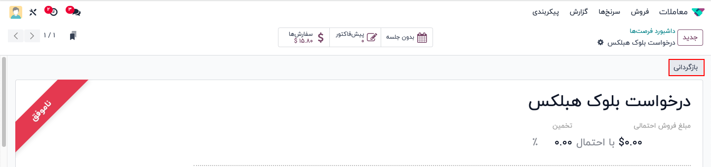 از فرم جزئیات فرصت ناموفق، روی گزینه بازگردانی در گوشه بالا سمت راست کلیک کنید. با این کار بنر قرمز ناموفق از فرم فرصت حذف میشود و نشان میدهد که فرصت بازیابی شده است.