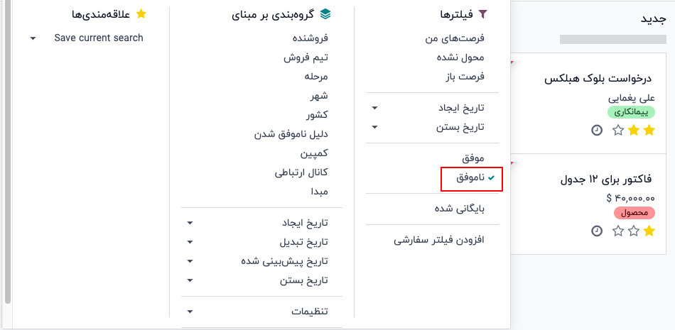 در ستون فیلترها، گزینه ناموفق را انتخاب کنید. با این کار تمام فرصتهای ناموفق در صفحه فرصتها نمایش داده میشود.