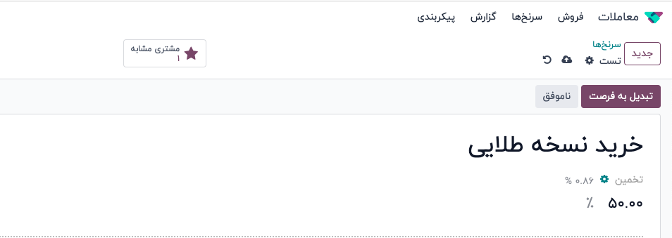 برای مقایسه جزئیات سرنخ ها و فرصت های فروش مشابه، به برنامه معاملات ‣ فرصت ها یا برنامه معاملات ‣ سرنخ ها بروید. یک سرنخ یا فرصت فروش را باز کنید و روی دکمه هوشمند «سرنخ های مشابه» کلیک کنید. با این کار نمایشی از نوع کانبان باز می شود که فقط سرنخ ها و فرصت های فروش مشابه را نشان می دهد.