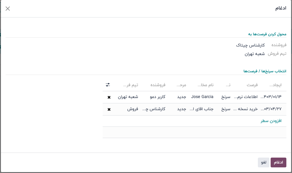 زیر این فیلدها، سرنخها/فرصتهای انتخاب شده برای ادغام همراه با اطلاعات مربوطه لیست شدهاند. برای ادغام آن سرنخها/فرصتهای انتخاب شده، بر روی "ادغام" کلیک کنید.