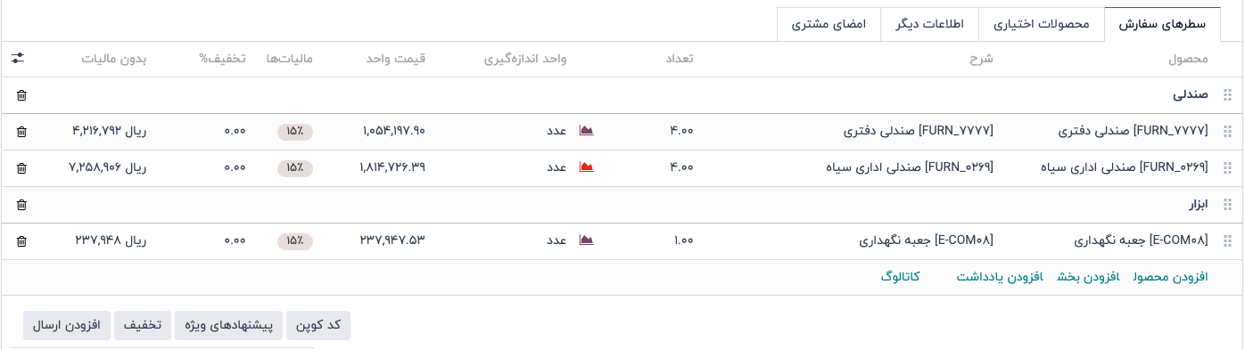برای این کار، روی "افزودن محصول" در تب خطوط سفارش کلیک کنید.