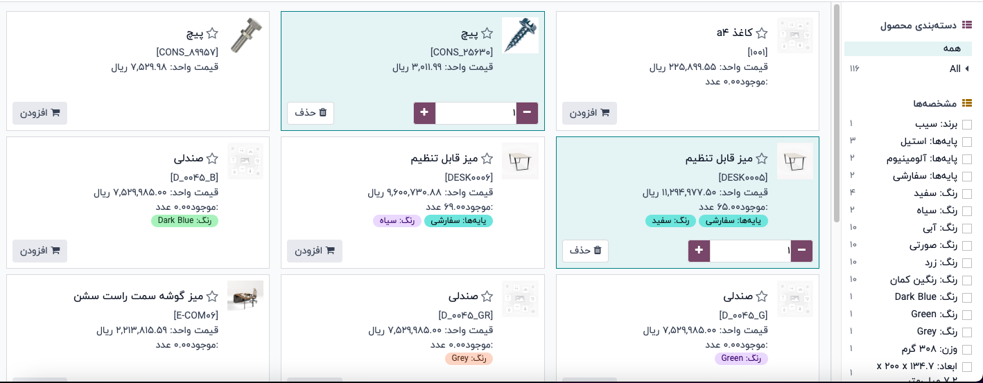 تمام محصولات موجود در پایگاه داده به صورت کارت لیست شدهاند و میتوانند در پنل راست بر اساس دستهبندی محصول و ویژگیها مرتب شوند.