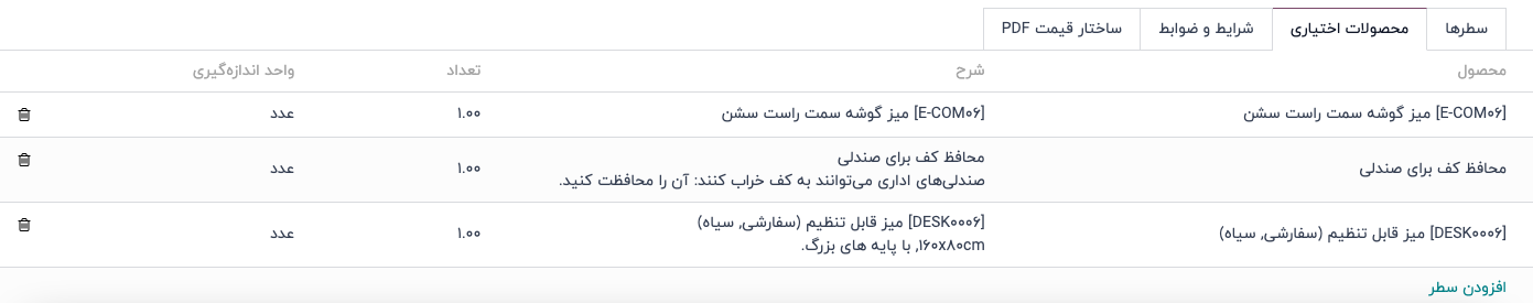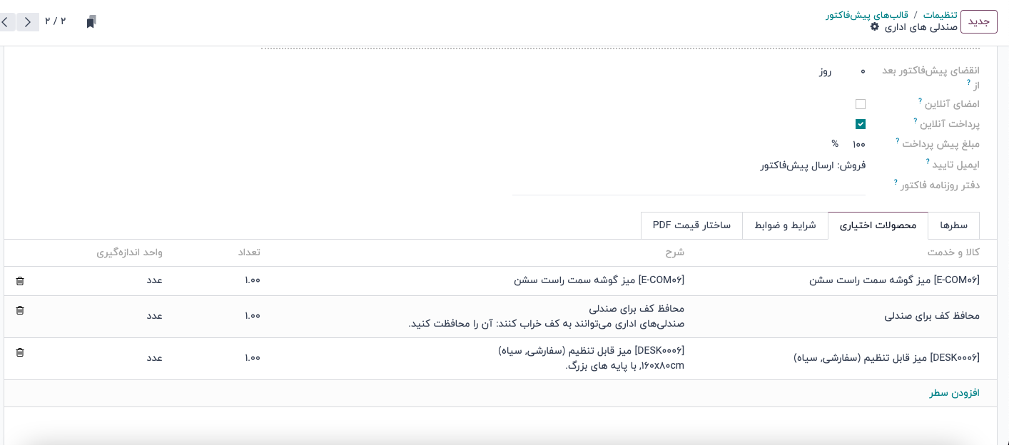محصولاتی که در زبانه محصولات اختیاری اضافه شدهاند بهطور پیشفرض هر بار که از آن قالب پیشفاکتور خاص استفاده شود اضافه می شوند. این محصولات میتوانند قبل از ارسال پیشفاکتور به مشتری، حذف شده و محصولات اضافی به آن اضافه شوند.
