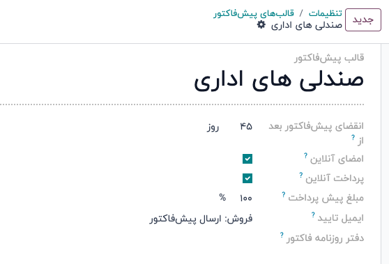 سپس، هر بار که از آن قالب پیشفاکتور خاص در یک پیشفاکتور استفاده شود، تاریخ انقضا بهطور خودکار بر اساس تعداد روزهای تعیینشده محاسبه میشود. با این حال، این تاریخ میتواند قبل از ارسال پیشفاکتور به مشتری تغییر یابد.