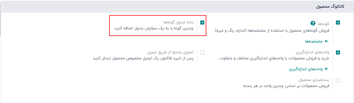 برای فعالسازی این تنظیم، به برنامه فروش ‣ پیکربندی ‣ تنظیمات بروید و به بخش کاتالوگ محصول بروید. سپس، تیک جعبه کنار گزینه داده جدول گونهها را بزنید و روی ذخیره کلیک کنید.