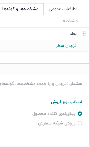 در پایین زبانه ویژگیها و گونهها، بخشی به نام انتخاب گونه فروش وجود دارد که دو گزینه دارد: پیکربندی کننده محصول و ورودی شبکه سفارش.