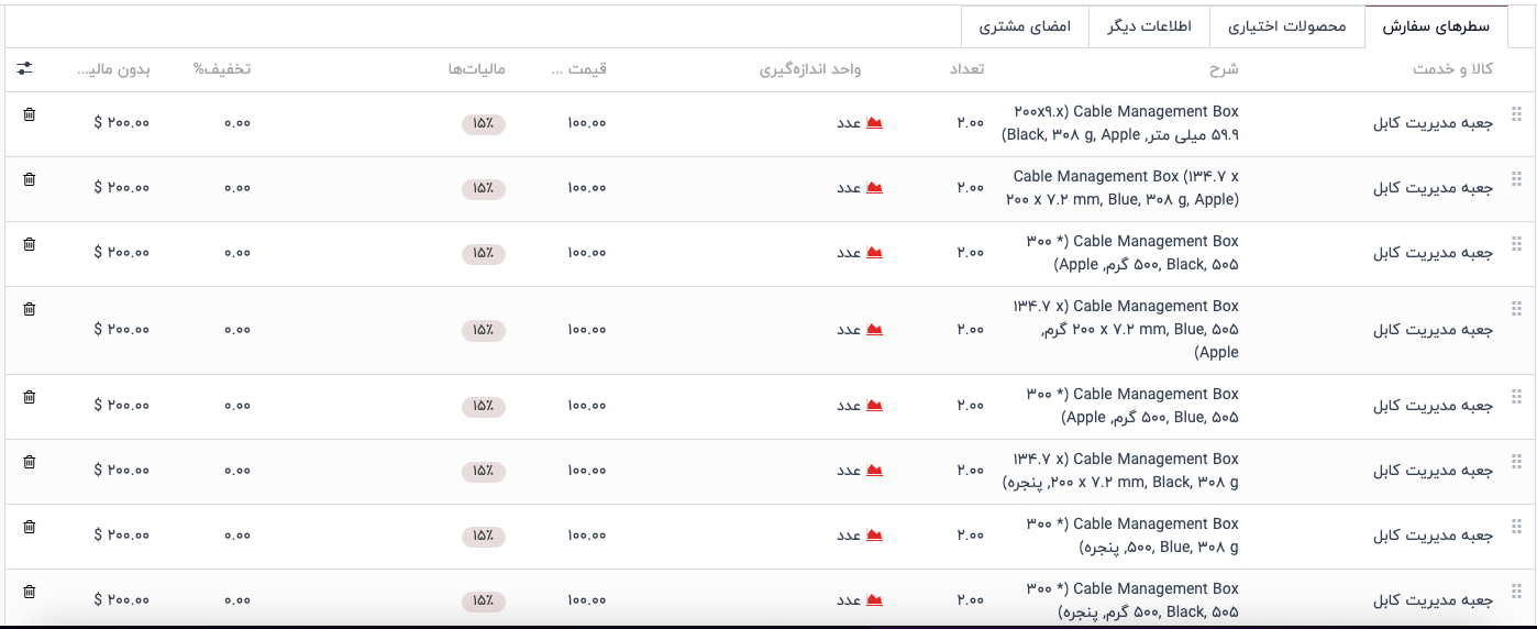 پس از انتخاب تمام مقادیر و گونههای مورد نظر، فروشنده به سادگی روی تأیید کلیک میکند و آن سفارشها بهطور فوری به پیشفاکتور/سفارش فروش در زبانه سطر های سفارش اضافه میشود.