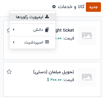 برای دانلود قالب واردات مورد نیاز، به برنامهی فروش ‣ کالا و خدمات ‣ کالا و خدمات بروید. در صفحهی کالا و خدمات، روی آیکون چرخدنده (⚙️) در گوشهی بالا-راست کلیک کنید. با این کار، یک منوی کشویی باز میشود.