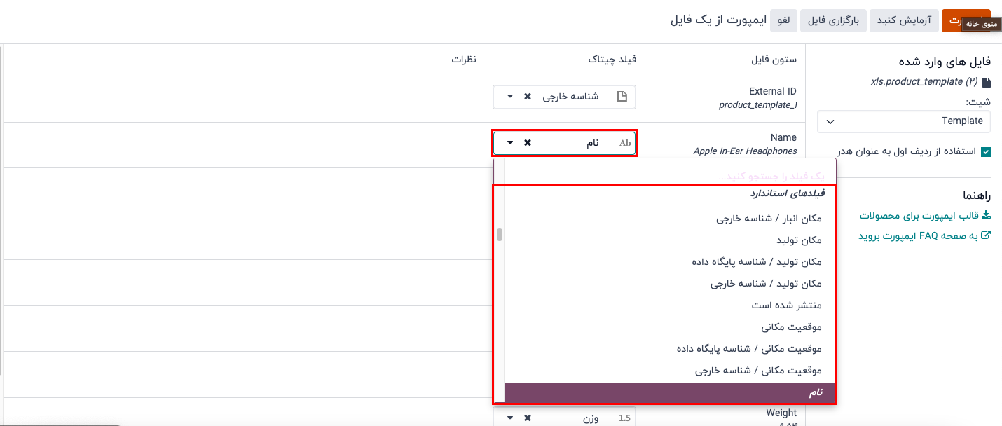 برای تطبیق دستی نام ستون با فیلد در چیتاک، روی منوی کشویی فیلد چیتاک در کنار ستون فایل که نیاز به تنظیم دستی دارد، کلیک کنید و فیلد مناسب را از منوی کشویی انتخاب کنید.