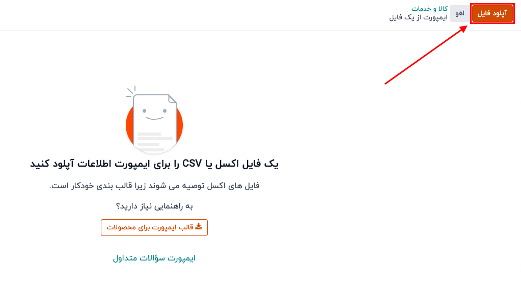 پس از سفارشیسازی اکسل قالب محصول، به صفحه ایمپورت محصول چیتاک بازگردید، جایی که لینک دانلود قالب قرار دارد، و روی دکمه بارگذاری فایل در گوشه بالا سمت راست کلیک کنید.