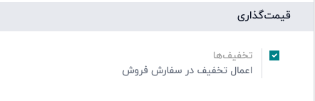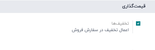 برای انجام این کار، به برنامه فروش ‣ پیکربندی ‣ تنظیمات رفته و در بخش قیمتگذاری، چکباکس کنار ویژگی تخفیفها را فعال کرده و سپس روی ذخیره کلیک کنید تا تمام تغییرات ذخیره شوند.