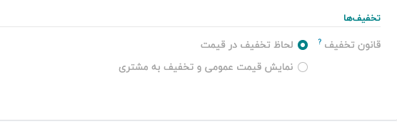 - توضیح: وقتی این گزینه انتخاب میشود، قیمتی که به مشتری نشان داده میشود، شامل تخفیف است. مشتری فقط قیمت نهایی را میبیند و قیمت اصلی یا میزان تخفیف را مشاهده نخواهد کرد.