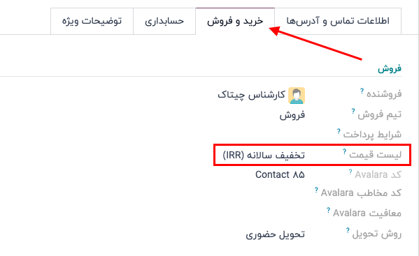 در فرم تماس مشتری مورد نظر، زیر زبانه خرید و فروش، در بخش فروش، مشخص کنید که چه لیست قیمتی باید به این مشتری خاص اعمال شود. برای این کار، از منوی کشویی موجود در فیلد لیست قیمت استفاده کنید.