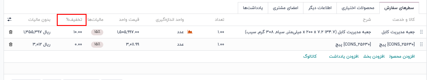 در بخش سطر های سفارش در فرم پیشفاکتور، یک ستون جدید با عنوان درصد تخفیف ظاهر میشود. این ستون برای تنظیم تخفیف بر روی هر خط محصول بهصورت جداگانه استفاده میشود. تخفیف مورد نظر را برای هر خط محصول وارد کنید و قیمت جدید بهصورت خودکار در مجموع پیشفاکتور در پایین صفحه محاسبه میشود.