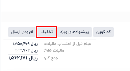 سپس، در فیلد تخفیف، مقدار تخفیف مورد نظر را تعیین کنید. لازم به ذکر است که میتوانید با تنظیم تخفیف منفی در این فیلد، یک اضافه قیمت نیز اعمال کنید.