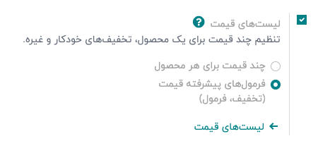 با این کار دو گزینه اضافی زیر آن ظاهر میشود: چند قیمت برای هر محصول و فرمول های پیشرفته قیمت (تخفیف، فرمول). یک لینک با نام لیستهای قیمت نیز ظاهر میشود که به صفحه جداگانهای هدایت میشود که در آنجا میتوان لیستهای قیمت را ایجاد و یا ویرایش کرد.