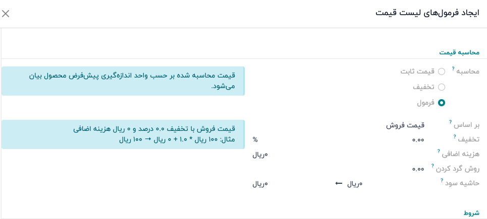 - فرمول های پیشرفته قیمت (تخفیف، فرمول): این گزینه امکان ایجاد قوانین دقیق قیمتگذاری و اعمال تخفیفها، حاشیهها و گردکردنها را فراهم میکند.