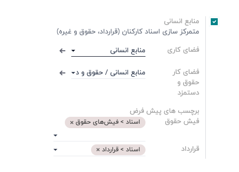 با رفتن به مسیر اسناد ‣ پیکربندی ‣ تنظیمات، میتوانید تمرکز فایلهای پیوست شده به یک بخش خاص از فعالیتهای خود را فعال کنید. به عنوان مثال، با انتخاب بخش منابع انسانی، اسناد مربوط به منابع انسانی به طور خودکار در فضایکار منابع انسانی قرار میگیرند، در حالی که اسناد مربوط به حقوق و دستمزد به طور خودکار در زیر فضایکار حقوق و دستمزد قرار میگیرند. شما میتوانید فضایکار پیشفرض را با استفاده از منوی کشویی تغییر داده و خصوصیات آن را با کلیک بر روی آیکون لینک داخلی ویرایش کنید.