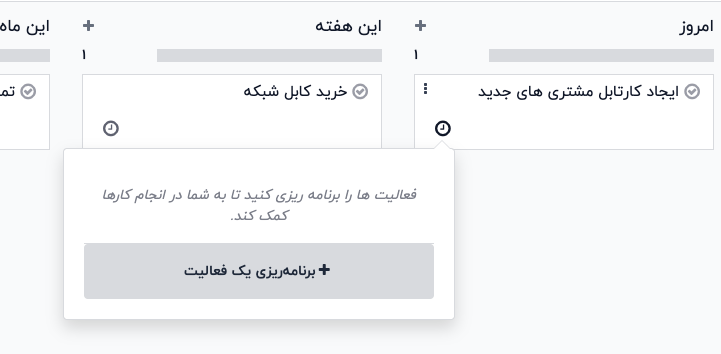 برای زمانبندی یک فعالیت در یک کار شخصی، ابتدا روی دکمه ساعت در صفحه اصلی برنامه کلیک کنید و سپس دکمه «+ برنامه ریزی یک فعالیت» را فشار دهید.