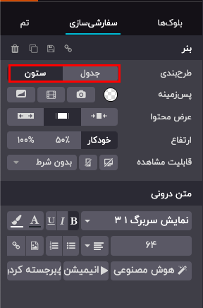 برای اکثر ابزارهای ساخت، میتوانید بین دو سبک طرحبندی شبکهای یا ستونی انتخاب کنید. برای تغییر طرحبندی پیشفرض، به تب سفارشیسازی بروید. در بخش بنر، گزینه شبکهای یا ستونی را به عنوان طرحبندی انتخاب کنید.