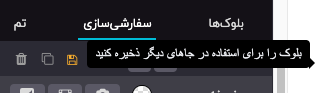 شما میتوانید یک بلوک سفارشیسازی شده را ذخیره کرده و در جای دیگر از آن استفاده کنید. برای این کار، بلوک را انتخاب کنید، به تب "سفارشیسازی" بروید و روی آیکون 💾 (فلاپی دیسک) کلیک کنید تا آن را ذخیره کنید.