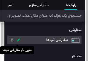 بلوکهای ذخیرهشده در بخش سفارشی تب بلوکها قرار دارند. برای ویرایش نام آنها، روی آیکون (قلم) کلیک کنید.