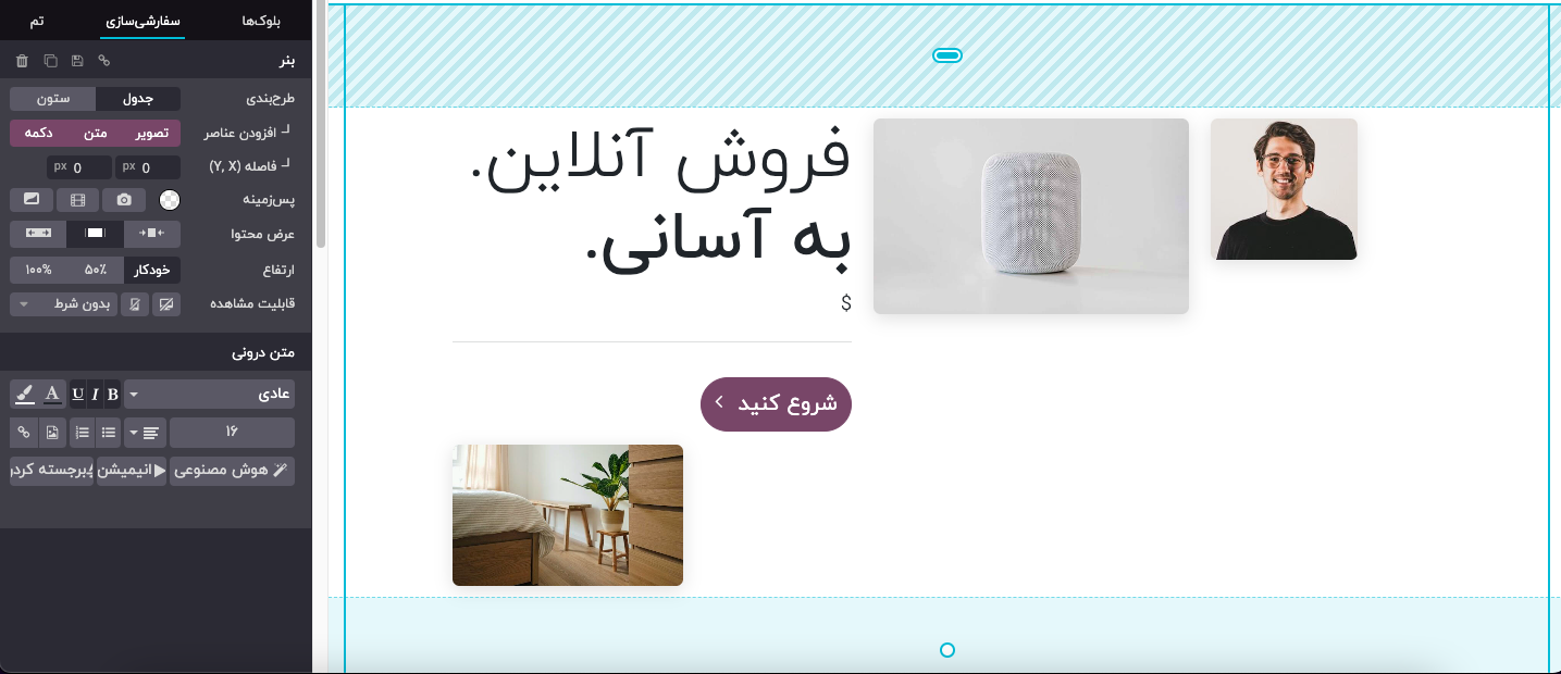 ویرایشگر وبسایت مجموعهای از بلوکهای ساختاری را برای طراحی چیدمان وبسایت شما ارائه میدهد که شامل سرفصلها، تصاویر و متنها میشود.