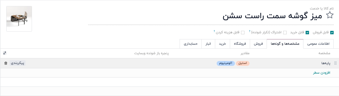 وبسایت ‣ فروشگاه آنلاین ‣ کالا و خدمات، محصول خود را انتخاب کنید و سپس به تب مشخصه ها و گونهها بروید.