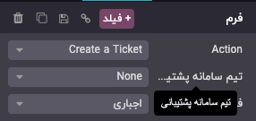 برای اضافه کردن فرم تماس، در صورت نیاز، یک صفحه جدید ایجاد کنید (+ جدید) و یک بلوک فرم را از بخش محتوای داینامیک به صفحه بکشید و رها کنید. پس از قرار دادن فرم، روی آن کلیک کنید (در حالت ویرایش) و در فیلد "عملیات"، گزینه "Create a ticket" را انتخاب کنید. سپس میتوانید انتخاب کنید که تیکت به کدام تیم پشتیبانی اختصاص یابد.