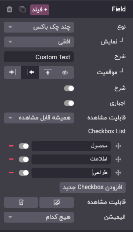 هنگام کلیک بر روی یک فیلد، یا هنگام اضافه کردن یک فیلد جدید (+ فیلد)، میتوانید نوع آن را انتخاب کنید. این امکان گزینههای مختلفی را فراهم میکند، مانند "چندین چکباکس"، که مشتریان میتوانند از آن برای نشان دادن خدماتی که به آنها علاقهمند هستند، استفاده کنند.