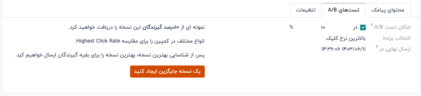 تستهای A/B به شما این امکان را میدهد که پیامکهای ارسالی را در برابر نسخههای دیگر در همان کمپین آزمایش کنید تا مشخص شود کدام نسخه در تولید تعامل و یا نتایج موفقتر است.