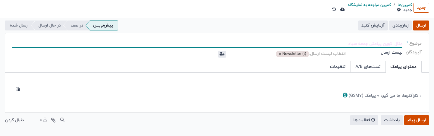 با هر کمپین، گزینههای ارسال، ارسال پیامک، ارسال ایمیل در بالای فرم الگو در دسترس است.