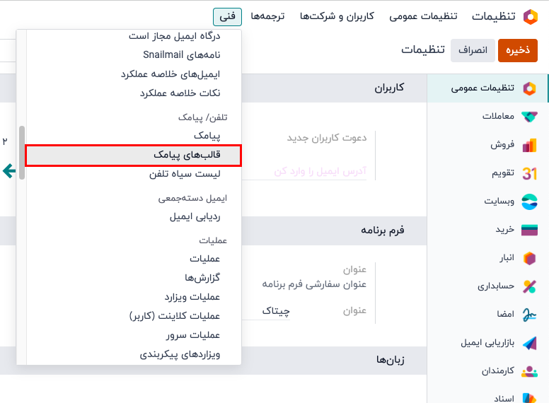 حالا دوباره به برنامه تنظیمات بازگردید و از منوهای قابلمشاهده در بالای صفحه، گزینه فنی ‣ الگوهای پیامک را انتخاب کنید تا بتوانید الگوهای پیامک را برای کمپینهای بازاریابی آینده تنظیم کنید.