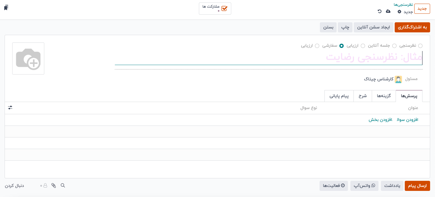 زیر فیلد نام نظرسنجی، فیلد مسئول وجود دارد. از منوی کشویی، یک کاربر را به عنوان مسئول نظرسنجی انتخاب کنید. بهطور پیشفرض، کاربری که نظرسنجی را ایجاد کرده است بهعنوان مسئول پیشفرض انتخاب میشود.