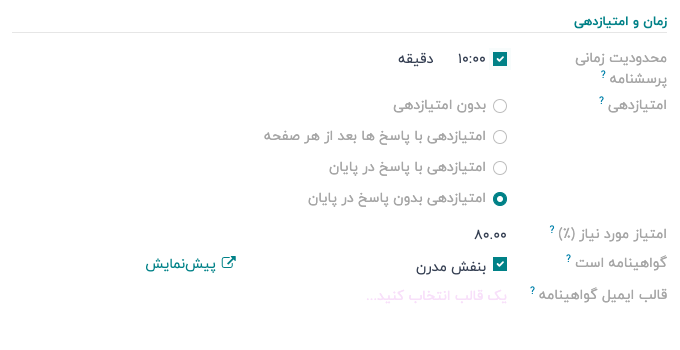 در بخش زمان و امتیازدهی، گزینه اول محدودیت زمانی پرسشنامه است. اگر این گزینه فعال باشد، مقدار زمانی (بر حسب دقیقه) را که به عنوان محدودیت زمانی برای نظرسنجی تعیین میشود، وارد کنید.