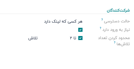 در نهایت، فیلد محدود کردن تلاشها وجود دارد. اگر این گزینه فعال شود، فیلدی اضافی در کنار آن ظاهر میشود که در آن کاربران میتوانند تعداد دفعاتی که کاربران میتوانند این نظرسنجی را امتحان کنند، تعیین کنند.