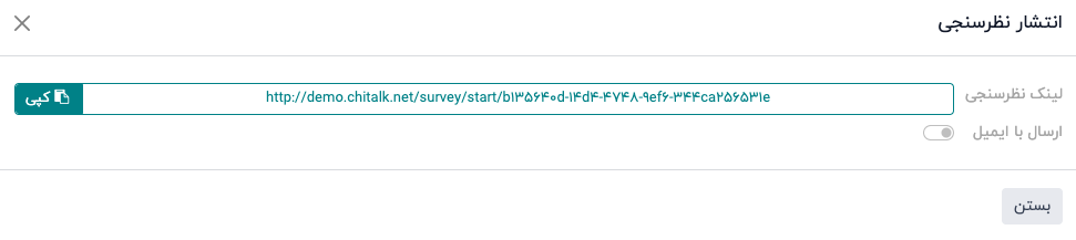 - اشتراکگذاری: با کلیک روی این دکمه، یک فرم پاپآپ برای اشتراکگذاری نظرسنجی نمایش داده میشود که میتوان از طریق آن شرکتکنندگان بالقوه (مهمان) را به نظرسنجی دعوت کرد. این فرم شامل یک لینک نظرسنجی است که می توان آن را کپی و برای شرکتکنندگان ارسال نمود. همچنین، یک سوئیچ ارسال از طریق ایمیل وجود دارد که با فعال کردن آن، گزینههایی برای وارد کردن ایمیل گیرندگان و موضوع ایمیل نمایش داده میشود.
