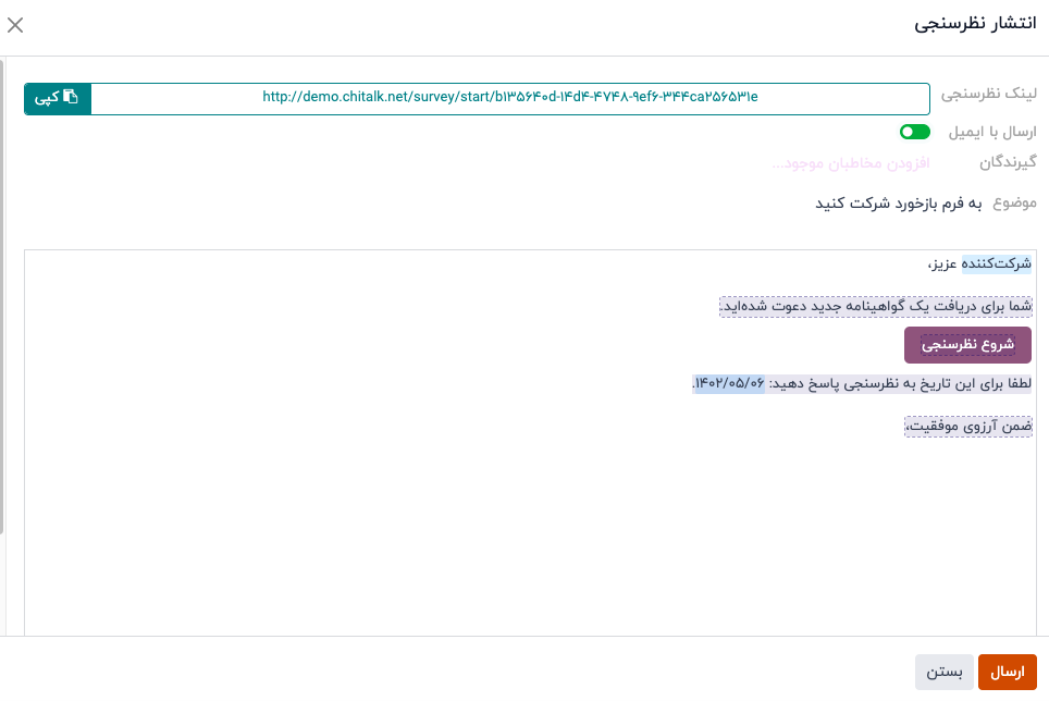 هنگامی که گزینه "ارسال با ایمیل" در حالت "فعال" باشد، فیلدهای اضافی ظاهر میشوند که در آنها میتوان گیرندگان و موضوع ایمیل را وارد کرد. در زیر این فیلدها، یک قالب ایمیل پویا نمایش داده میشود که شامل یک دکمه "شروع نظرسنجی" است. این قالب ایمیل نیز قابل ویرایش و شخصیسازی است.
