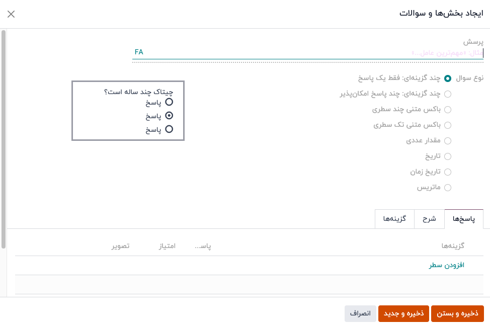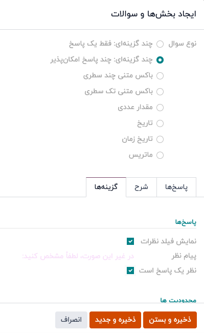 وقتی همه تنظیمات مورد نظر انجام شد، روی ذخیره و بستن کلیک کنید تا پرسش ذخیره شده و به فرم نظرسنجی بازگردید، یا روی ذخیره و جدید کلیک کنید تا پرسش ذخیره شده و بلافاصله یک پرسش جدید در یک پنجرهی پاپآپ ایجاد بخش ها و سوالات جدید ایجاد شود.
