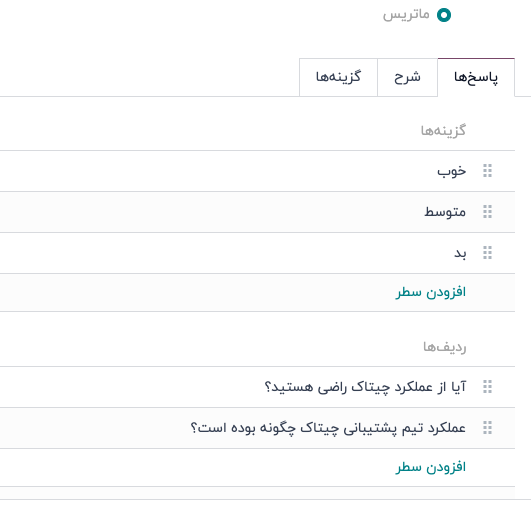 استثنا از این قاعده زمانی است که گزینه ماتریس به عنوان نوع سوال انتخاب شده باشد. اگر این گزینه انتخاب شود، تب پاسخها باقی میماند، اما در زیر بخش معمولی انتخابها، یک بخش ردیفها وجود دارد. زیرا گزینه ماتریس یک جدول پاسخ برای پر کردن توسط شرکتکنندگان فراهم میکند.