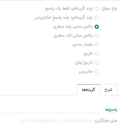 - باکس متنی چند سطری: یک پرسش باز که شرکتکنندگان میتوانند در آن پاسخ چندخطی وارد کنند.