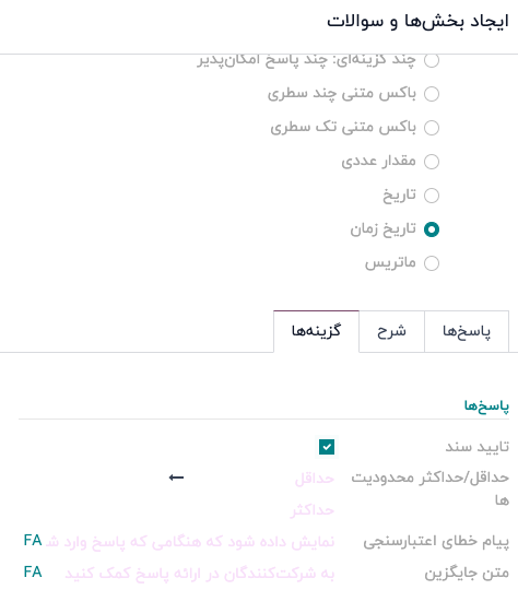 - تاریخ و زمان: یک پرسش مبتنی بر تاریخ که شرکتکنندگان باید یک تاریخ و زمان (سال-ماه-روز، ساعت-دقیقه-ثانیه) را به عنوان پاسخ وارد کنند.