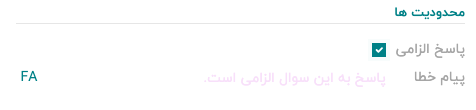 وقتی پاسخ الزامی فعال میشود، به این معناست که پاسخ دادن به آن سوال خاص برای شرکتکننده قبل از ادامه ضروری است. همچنین، با فعال کردن پاسخ اجباری، یک فیلد اضافی با نام پیام خطا نمایان میشود.