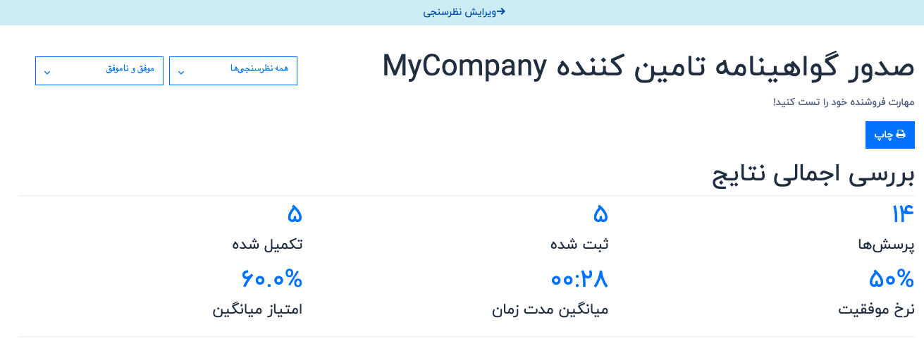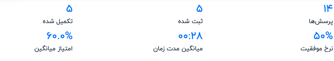 این بخش از صفحه نتایج، مجموعهای خلاصهشده از دادهها و معیارهای مرتبط با نظرسنجی را ارائه میدهد که برای تحلیل سریع مفید هستند.