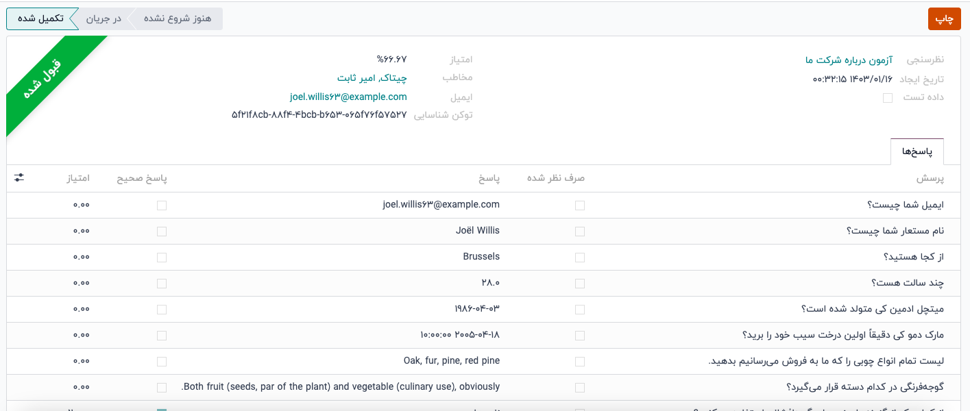با کلیک بر روی عنوان نظرسنجی در لیست تو در تو، نظرسنجی از لیست خارج شده و شرکتکنندگان مربوطه به همراه دادههای مربوط به پاسخهای آنها برای آن نظرسنجی در صفحه نمایش داده میشود.
