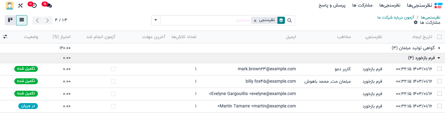 برای مشاهده فهرست کلیه شرکتکنندگان در هر نظرسنجی در پایگاه داده، به بخش نظرسنجیها بروید و گزینه مشارکت ها را انتخاب کنید. در اینجا، هر نظرسنجی در پایگاه داده به صورت لیست تو در تو نمایش داده میشود و در کنار عنوان هر نظرسنجی، تعداد شرکتکنندگان در پرانتز نمایش داده شده است.